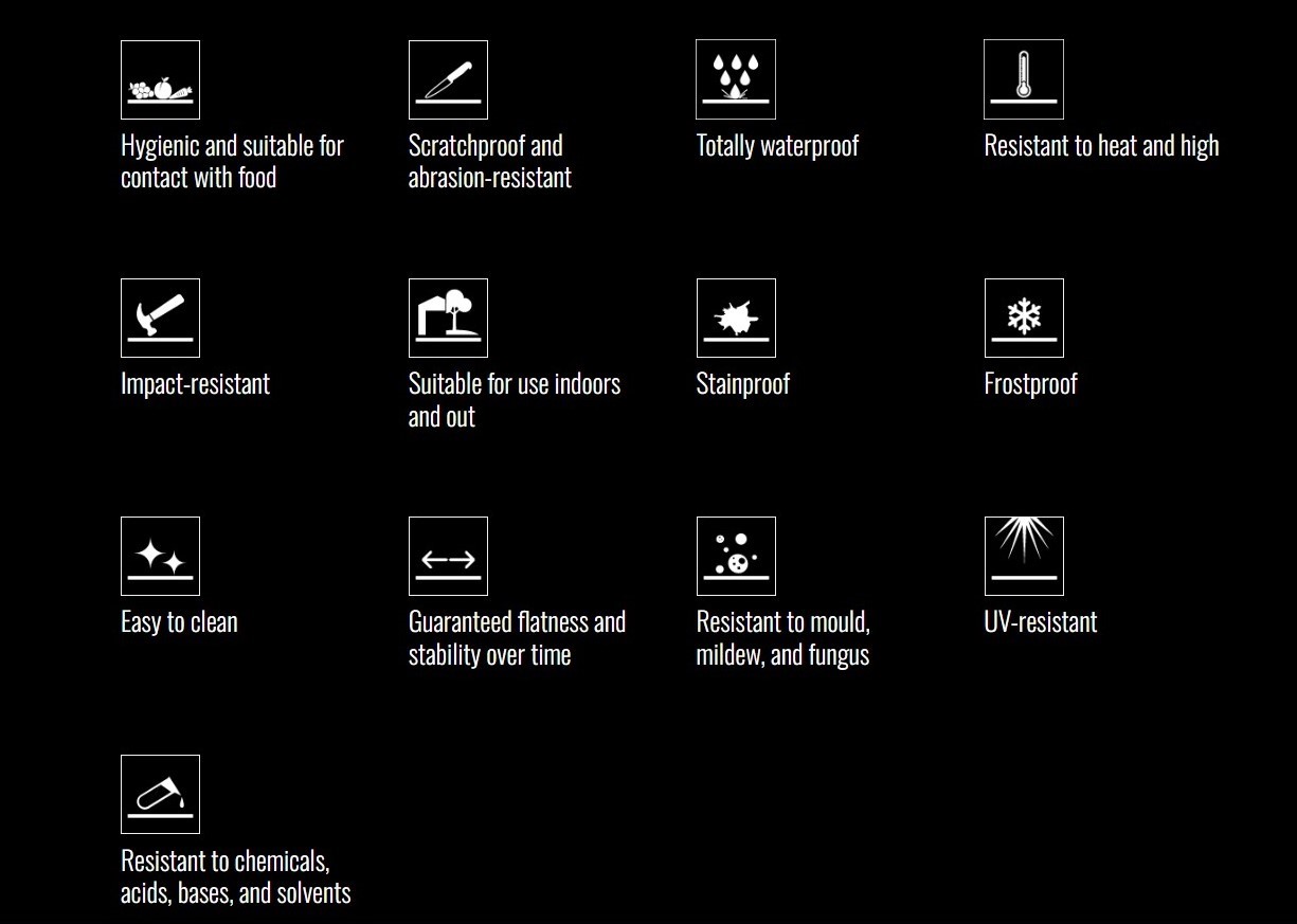 Οι Κεραμικοί Πάγκοι Ιταλικής προέλευσης που διαθέτει η CUCINA MIA είναι μη πορώδεις και δεν έχουν απορροφητικές ιδιότητες, διαθέτουν αντοχή σε οξέα και λεκέδες, και είναι πολύ ανθεκτικοί σε πολύ υψηλές θερμοκρασίες. Δεν χαράσσονται και είναι ανθεκτικοί στον χρόνο. Δεν χρειάζονται ειδική συντήρηση, είναι εύκολοι στον καθαρισμό και δεν συσσωρεύουν μικρόβια.
